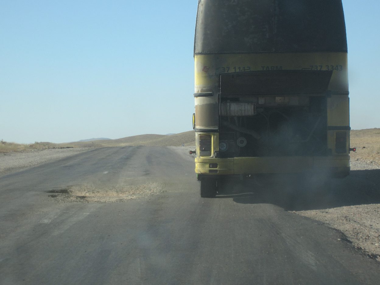Es so heiß, daß die Busse mit offener Motorklappe fahren müssen.